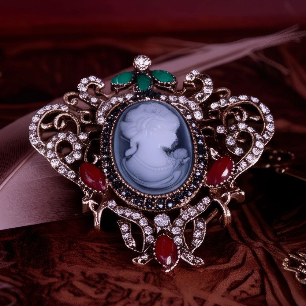 En son cœur, un camée gris bleuté, sculpté avec minutie, dévoile le visage raffiné d’une dame intemporelle. La monture, une arabesque dorée sertie de cristaux étincelants, danse autour d’elle dans un enchevêtrement somptueux. Trois feuilles vert émeraude coiffent la scène, tandis que quatre cabochons rouge profond, semblables à des gouttes de rubis, ajoutent à cette parure une intensité passionnée ❤️. Chaque détail respire l’élégance du XIXᵉ siècle : le goût pour l’ornementation fastueuse, l’amour du portrait miniaturisé, le plaisir de porter un bijou qui raconte une histoire.